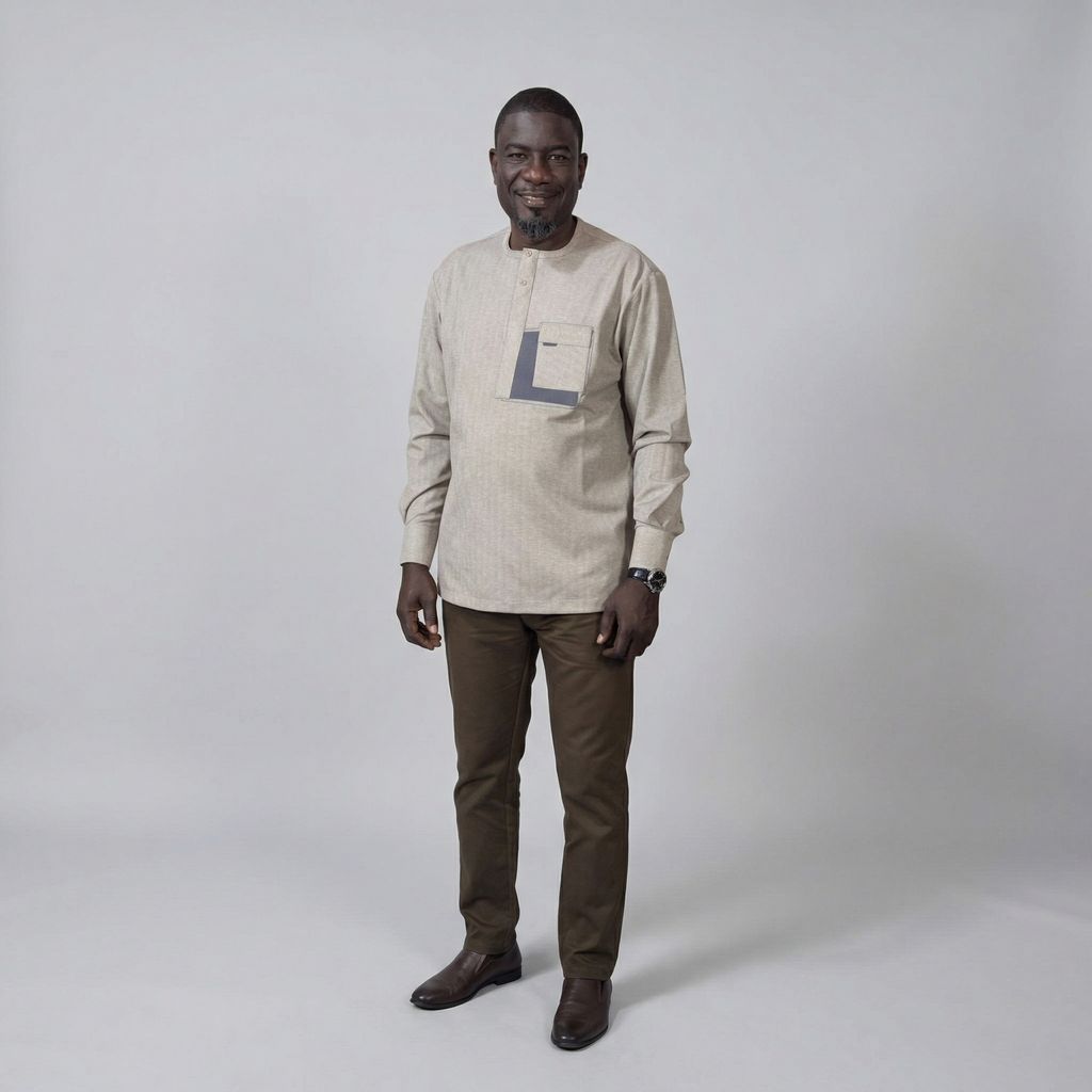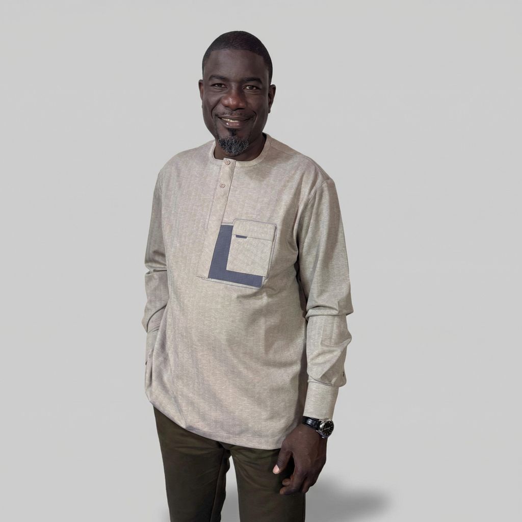 La chemise africaine homme AMCHOU allie élégance et modernité. Confectionnée en coton super cent, avec poche poitrine et broderie grise, elle est disponible en beige foncé et en tailles M à 3XL. Idéale pour cérémonies, bureau ou sorties chic, elle reflète le style africain raffiné et contemporain. Confortable, durable et polyvalente, c’est un incontournable du dressing masculin moderne.